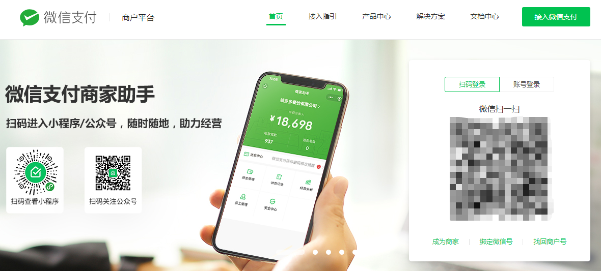 第二步:浏览器搜索“微信支付商户平台”进入到微信支付商户平台官网,需要微信支付商户号的超级管理员,微信扫码登录到商家自己的商户号后台(如下图)