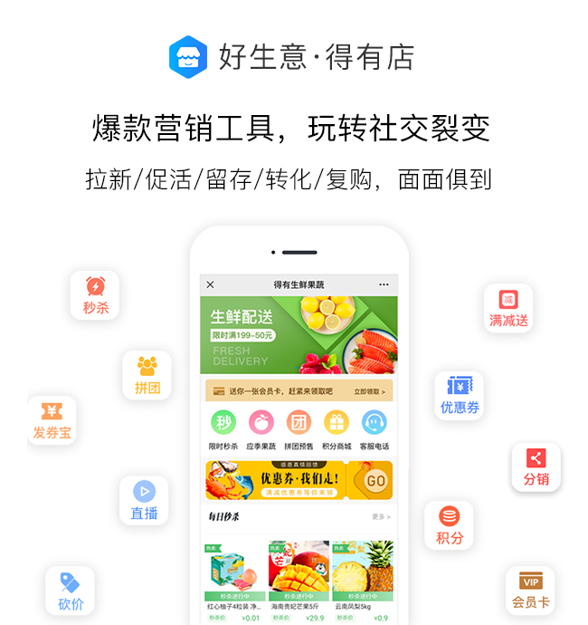 得有店除了提供小程序工具上的扶持,更有专业的运营策划、店铺诊断、方案落地、店铺装修等服务,帮助商家真正把店铺运作起来。如果在运营的过程中遇到任何问题,都可以咨询得有店来解决。
