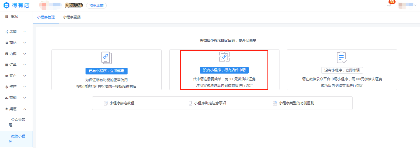 在搭建小程序前,需要先在微信公众平台注册一个小程序账号。那么注册小程序需要钱吗?这要看你注册哪种类型了,如果是个人的账号,就是免费的,但是个人类小程序无法开通支付功能。如果是企业类型的小程序,那么注册时会需要你缴纳300元认证费。不过如果你使用得有店代申请注册,这300元认证费是可以省去的,注册审核通过后再到得有店进行绑定即可。