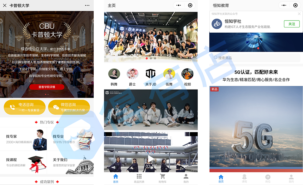 1.展示首页:包括商铺详情、师资介绍、VR全景环境展示等;