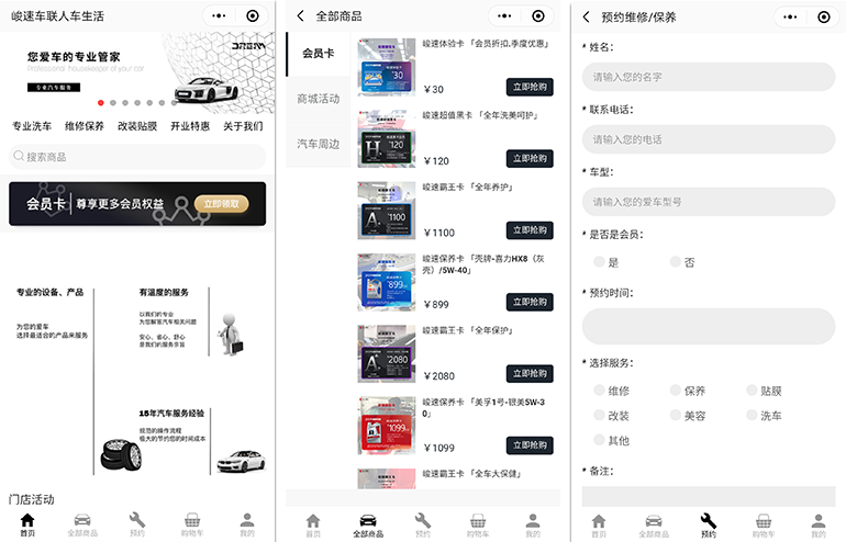 下面展示的是汽车服务行业的得有店某客户案例,主要以会员卡+预约到店的服务,店铺主页也展示了门店优势,增强用户的信任度,主题色是以有质感的黑色为主,广告位是以吸引用户成为会员。整体比较简单,并展现了门店核心业务及服务特色。