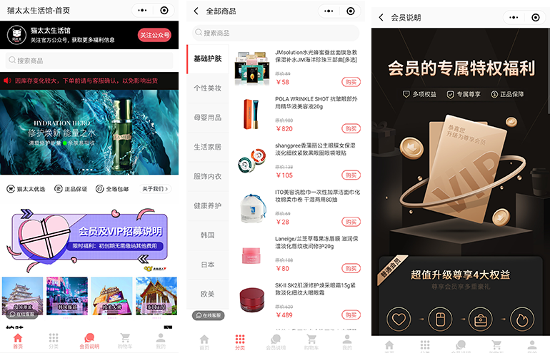 下面展示的是美妆行业的得有店某客户案例,自主搭建,顶部借助「关注公众号」组件,为公众号引流。在营销上主要用了会员卡的形式,成为会员可以享受相应的特权,来吸引用户成为会员。本店铺涵盖了各国的美妆品牌,以「正品」、「优选」、「包邮」的字眼来增进用户的信任感。
