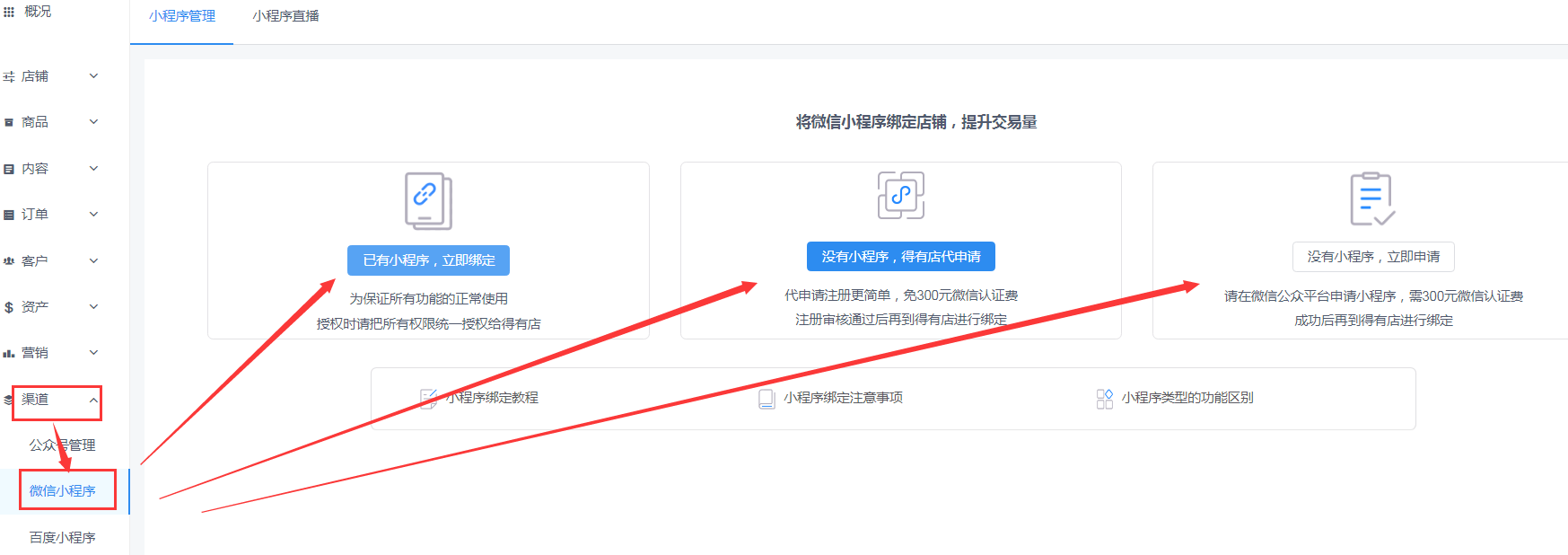 5、在商品添加完成之后,我们找到渠道,在渠道里找到微信小程序,在本页面可以进行小程序的绑定,以保证所有功能的正常使用。