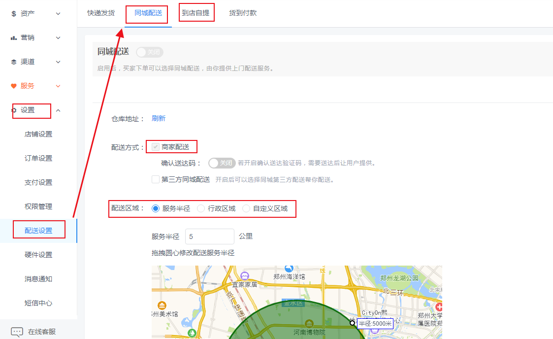 6、在设置中,我们可以找到配送方式,设置外卖的类型,同城配送、到店自提的形式,根据店铺的销售形式进行选择。以同城配送为例,我们可以设置它的配送区域,配送方式等。