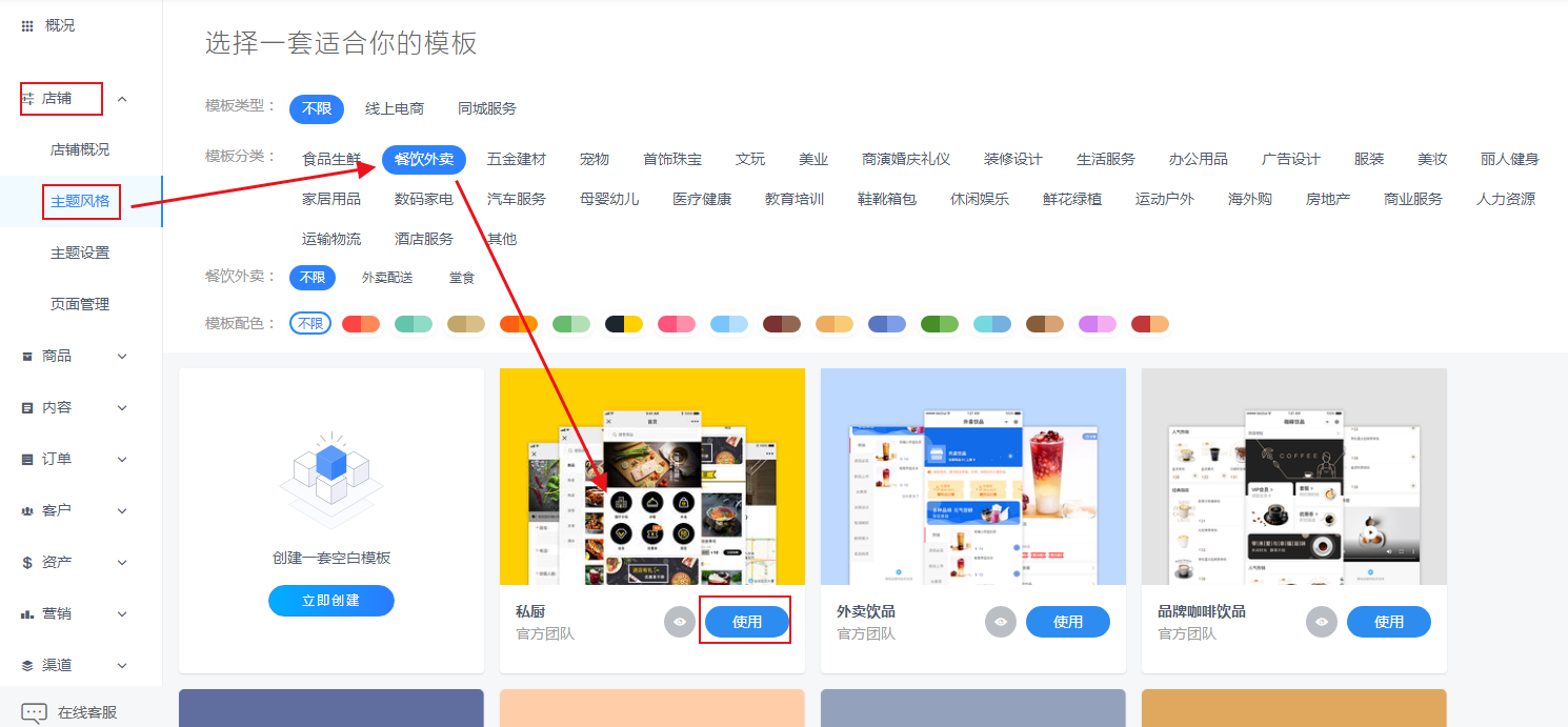 2、注册一个得有店免费账号,登陆进去,打开店铺,选择主题风格,选择餐饮外卖,找到自己喜欢的店铺风格模板,也可以将自己不喜欢的图片换成自己的,直接拖拽就可以完成。