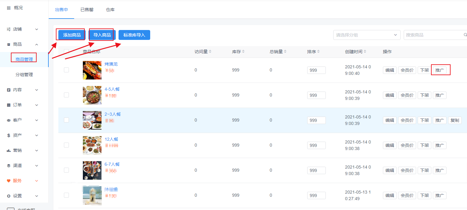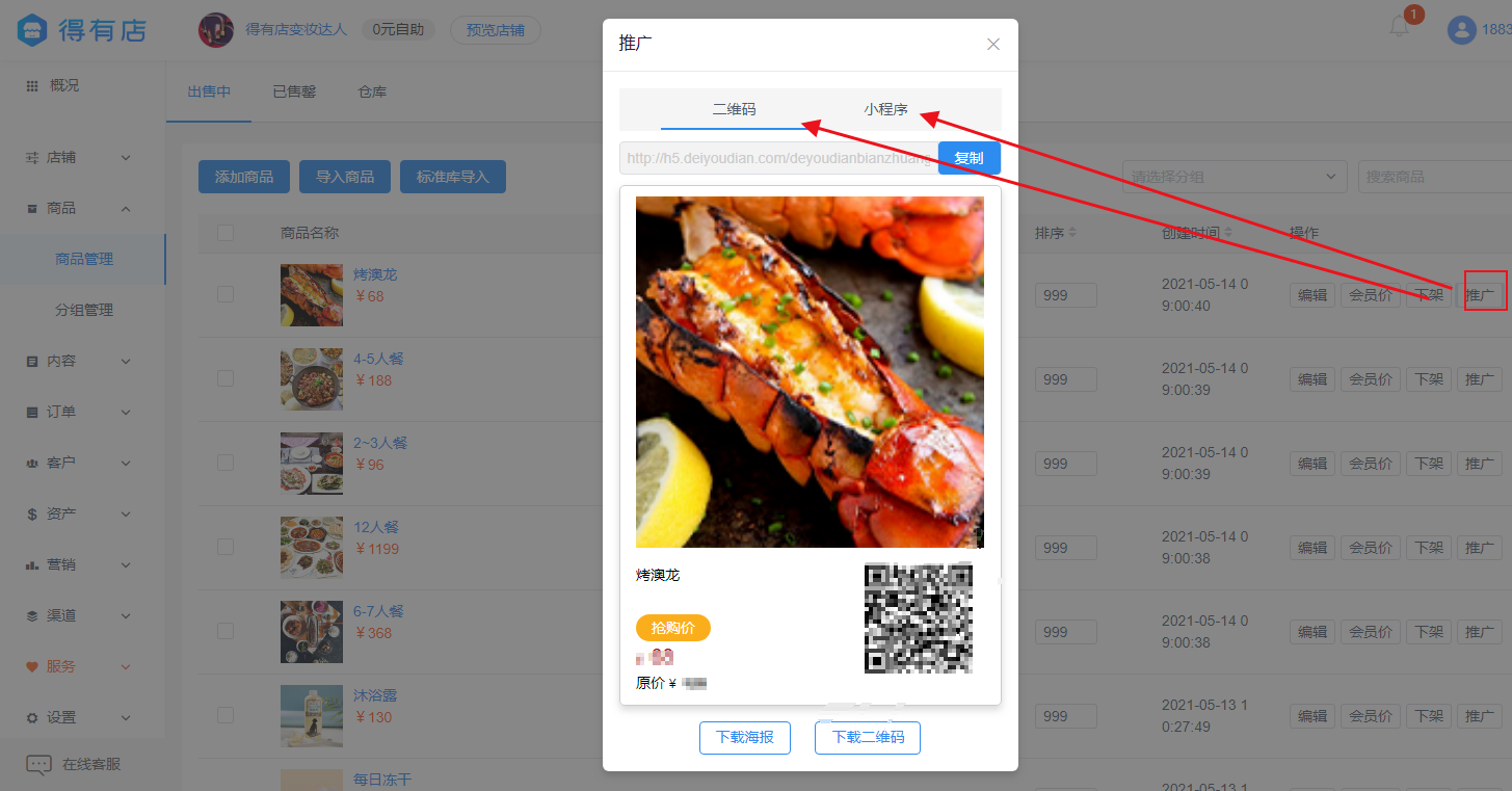 4、在商品管理页面的右侧有几个组件,这些都是可以利用的,其中有一个推广按钮,点进去,我们可以看到它会自动生成推广二维码,还有一个小程序链接,可以下载进行分享,让更多的人看到小程序商品信息。在完成之后,可以点击预览店铺,使用手机扫码就可以直接查看店铺信息了。