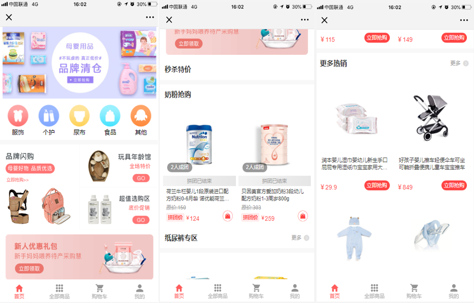 2、面对奶粉销量有限,客单价较低的问题,商家可以利用小程序的各个模块进行改正,将商品进行精细化分组,设置福利专区等等,针对有目的购物的顾客,节省她们的时间,提高用户满意度。挖掘商品价值,刺激用户购买。