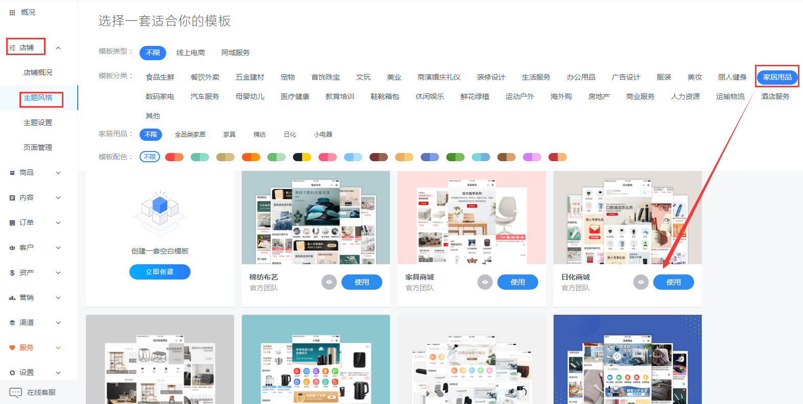 进入店铺之后,选择家居用品,选择适合自己店铺的行业模板,然后将自己店铺的商品与模板中的商品进行替换,只需要轻轻拖拽即可完成。