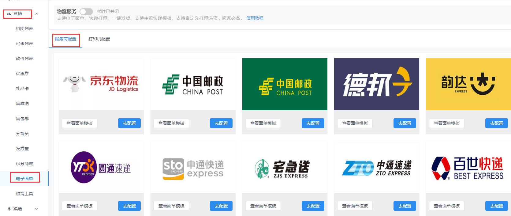 在营销中找到电子面单,可以配置物流,选择面单模板,然后进行配置然后再连接打印机就可以了。