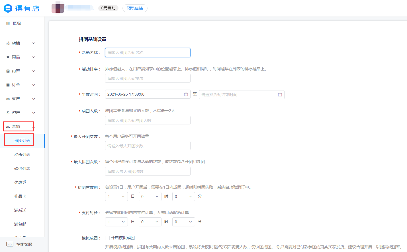 3、在营销中找到拼团,根据自己的店铺情况,设置拼团模式。