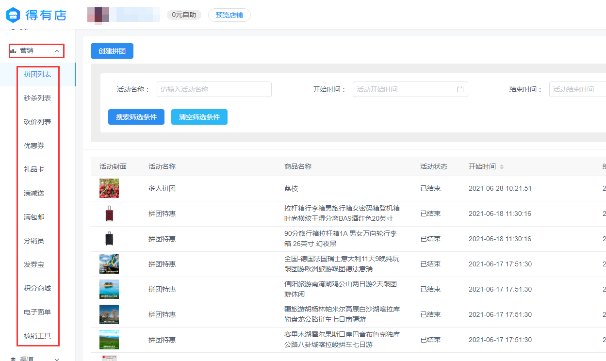 商家可以直接在得有店—营销工具栏进行营销活动设置,选择参与商品、时间、价格等等。