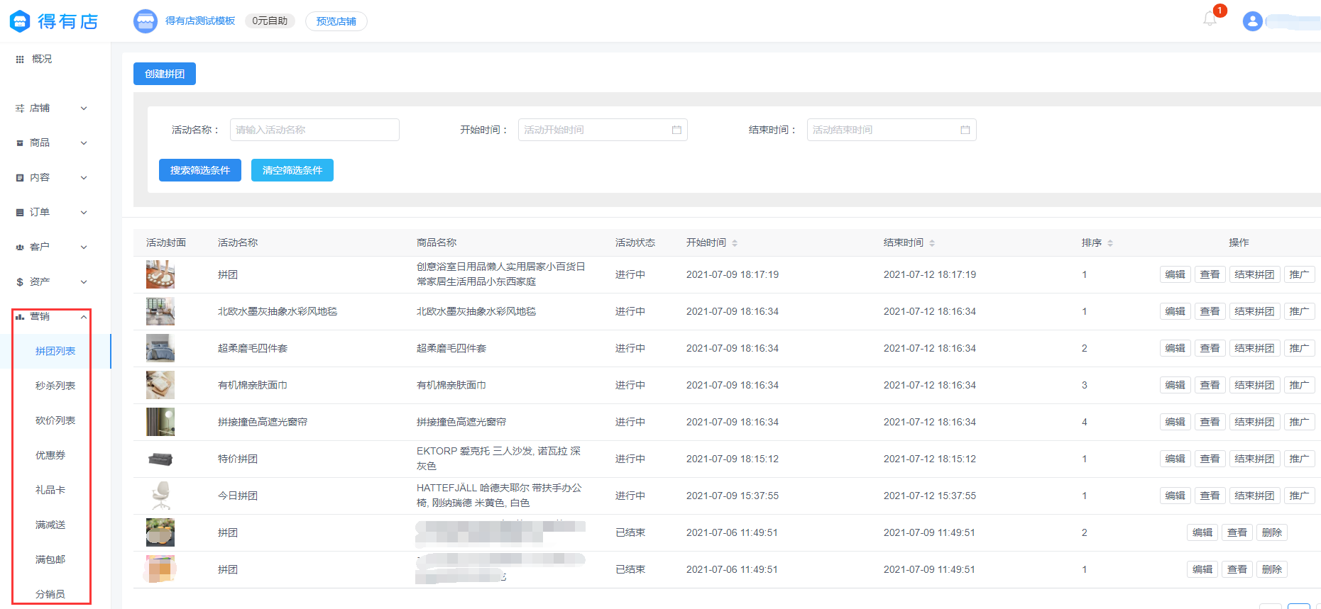对于各商品情况,商家可以在营销页面进行营销玩法的设置,如秒杀、拼团、优惠券、满减送、分销员等等,商家可以根据自己的店铺情况进行合理转换。