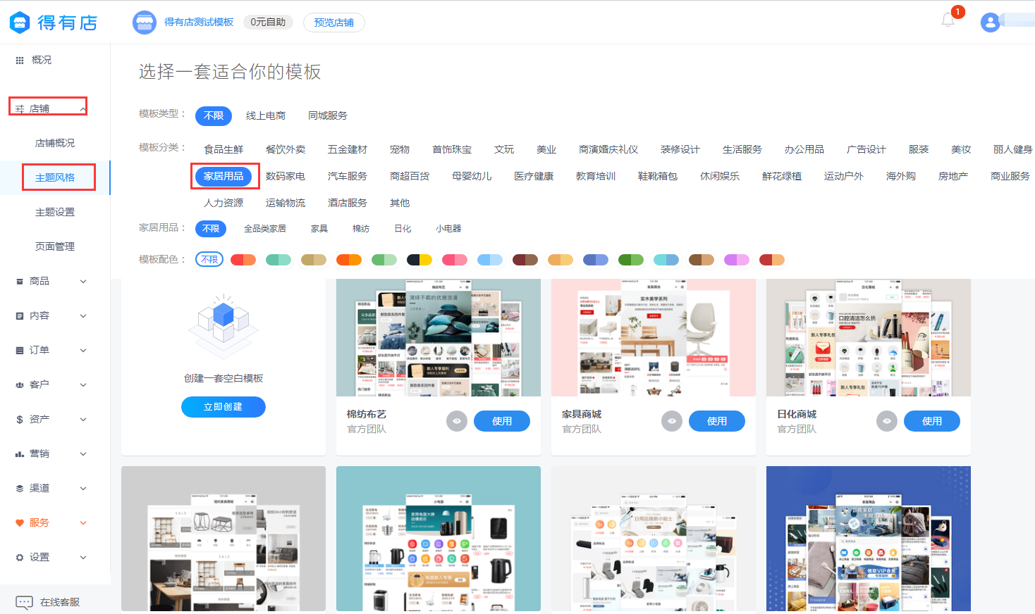 进入得有店商家管理后台,找到店铺主题风格,然后在家居用品栏选择自己喜欢且适合的店铺模板,一键套用,如果不喜欢,也可以自己自由DIY设计,就像搭积木一样简单。