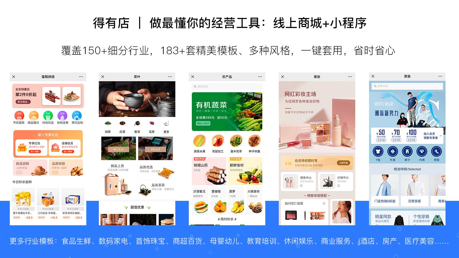 得有店系统中拥有多种营销玩法,包括秒杀、拼团、优惠券、会员卡、分销等等,可以助力商家高效运营小程序,提升店铺销量。除此之外,商家还可以利用小程序与社群、朋友圈、公众号等进行结合,提升店铺曝光量,打造营销闭环,实现用户留存与复购。