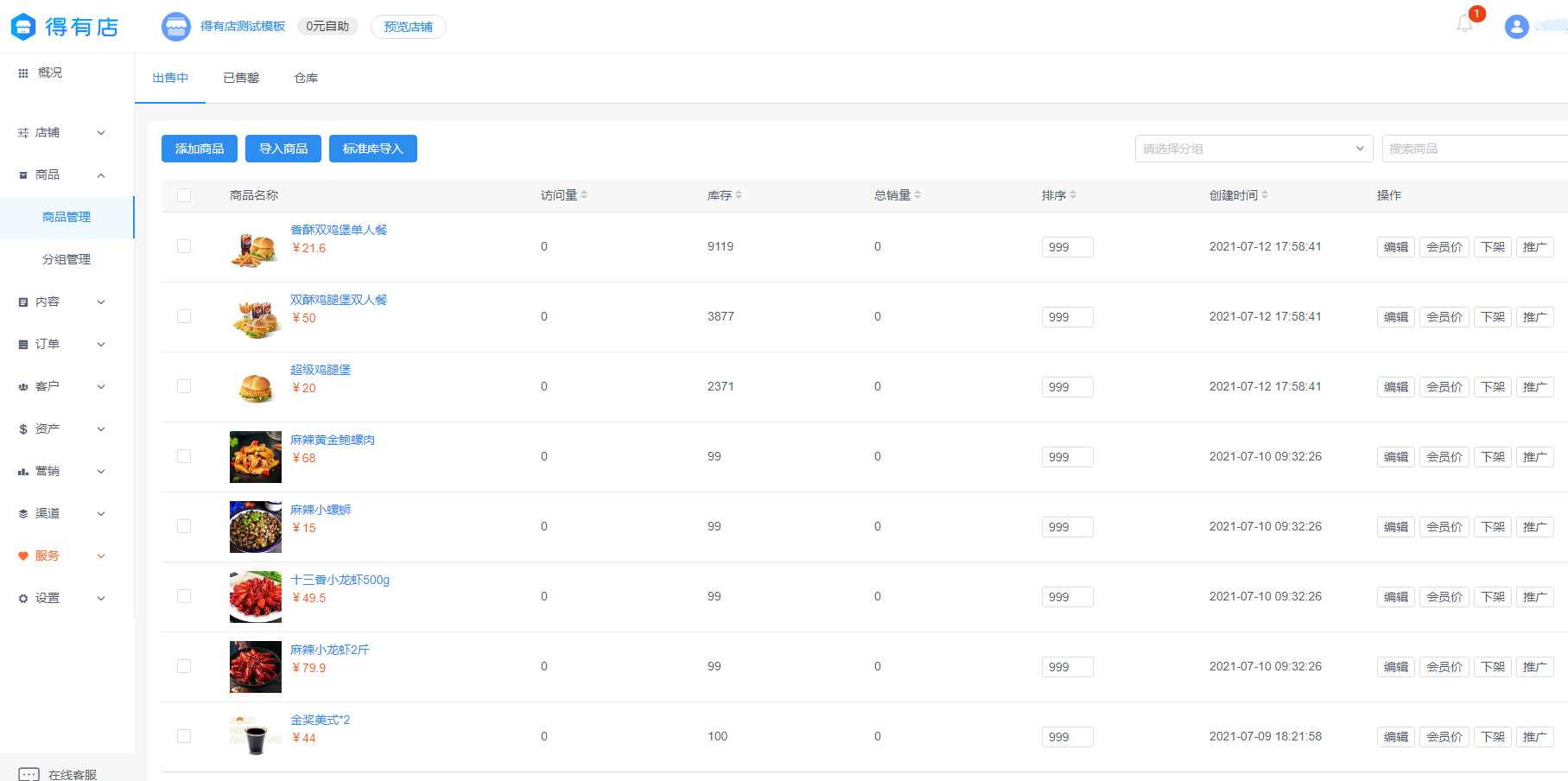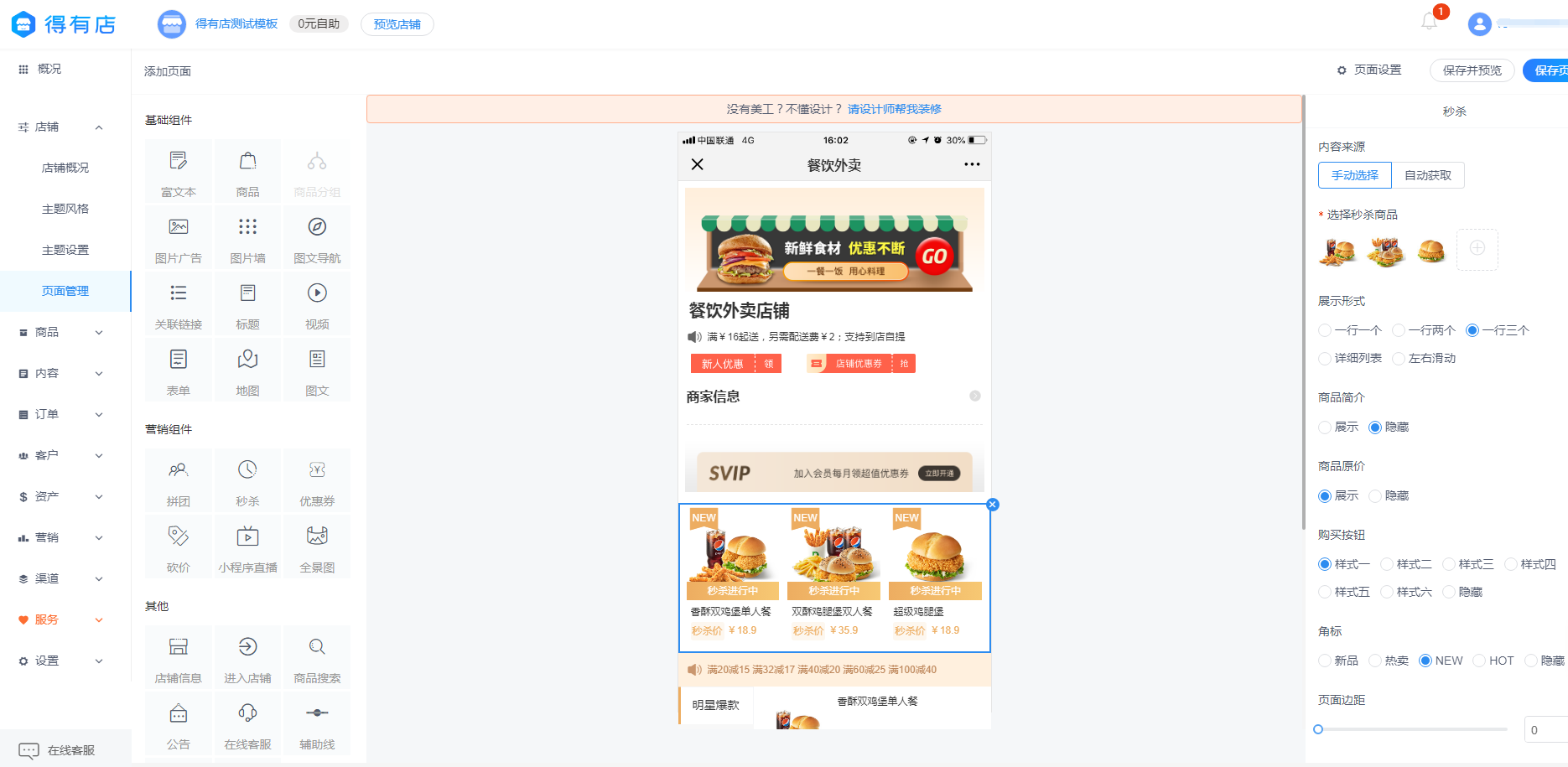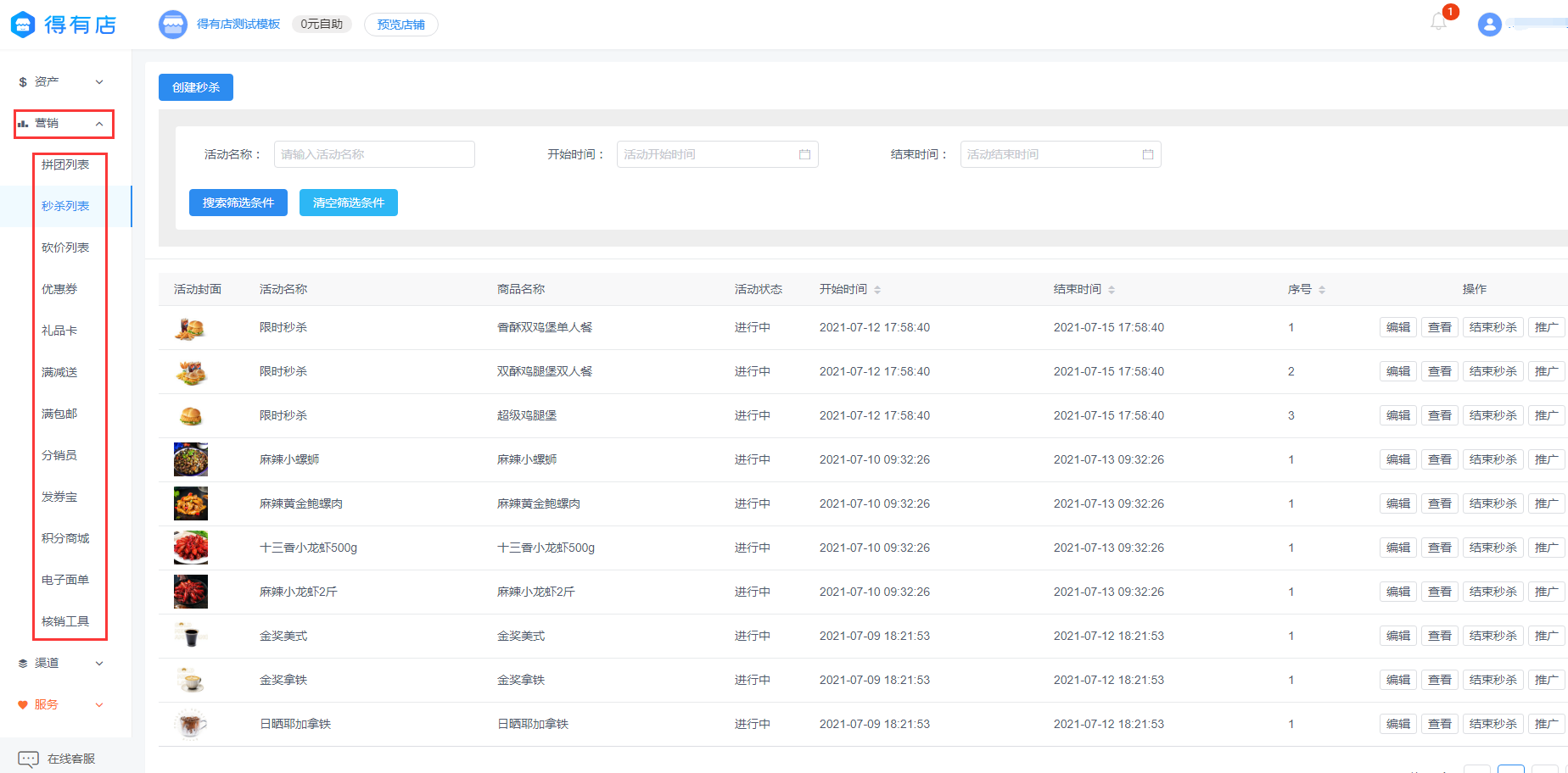 5、商品添加完成,商家可以在营销页面,对于商品进行营销组件的设置,比如秒杀、拼团、优惠券、分销等等,商家可以根据商品的属性进行合理设置,以此拉动店铺销量。