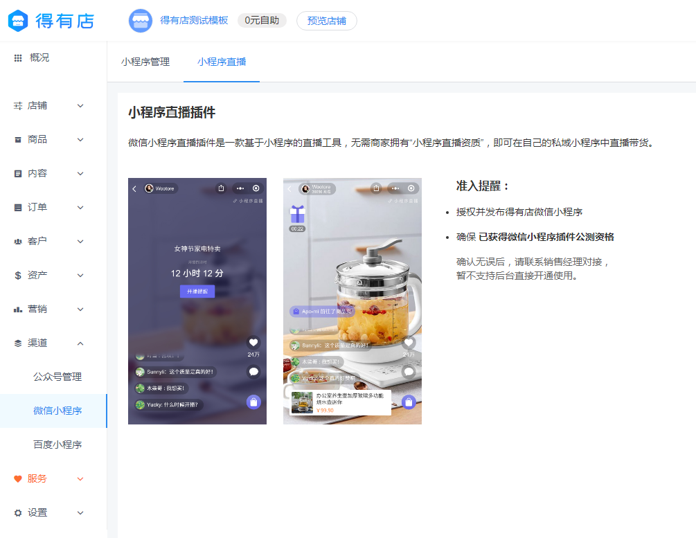 6、除了营销工具的设置,商家还可以插入直播,微信小程序直播是一款基于小程序的直播工具,不需要商家拥有“小程序直播资质”,就可以在自己的私域小程序中进行直播带货,商家可以在直播间宣传自己的店铺或者商品,实现引流。