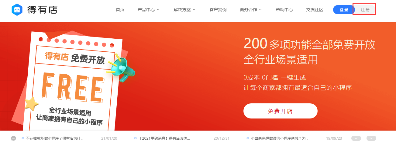 1、进入得有店官网http://www.deiyoudian.com注册账号,创建小程序店铺。