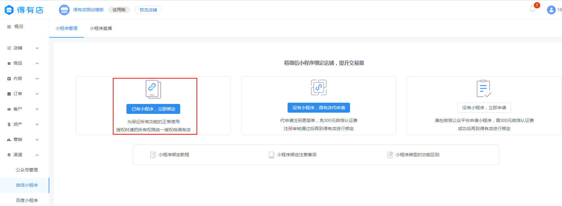 绑定路径:渠道—微信小程序—已有小程序,立即绑定