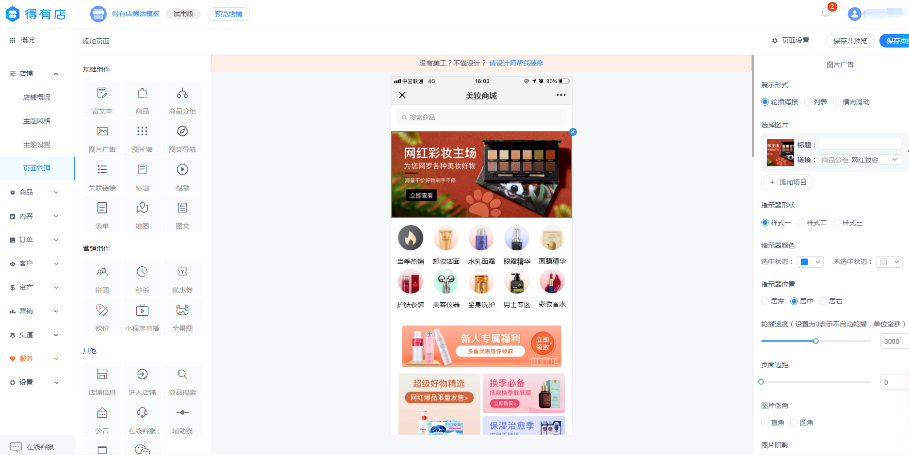 如果美妆店想搭建小程序店铺,对于没有太多搭建经验,又没有太多预算的商家,可以直接通过得有店一键生成适合自己的线上商城,无需开发,直接套用行业主题模板,拖拽式组合搭建,0基础也能轻松搭建。