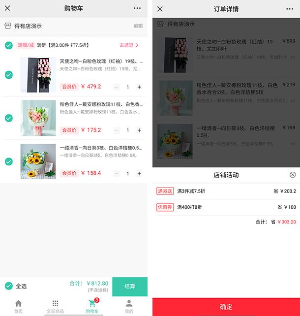 消费者为了获取优惠和包邮权益,会选择凑单购买。商家应紧扣消费心理,将商城主页的全部商品或部分商品设置为满N元减、满N元送、满N元打折、满N元包邮等方式,吸引顾客下单,提高单价与销量。实惠越多,顾客下单率越高,因此优惠叠加也是不错的玩法。