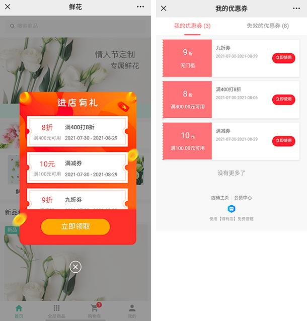 这是一种百搭实用的营销玩法。商家根据产品单价和用户需求,在商城主页、关联的公众号菜单以及门店收银台设置领取入口,同时与发券宝、会员积分等工具搭配使用,达到全方位沉淀粉丝的效果。