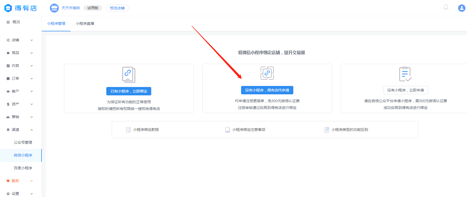 也可以通过得有店代申请小程序,注册流程更简单,还能省去交给微信平台的300元认证费用。